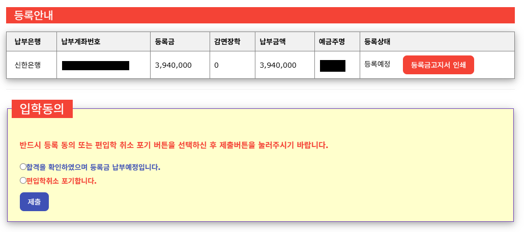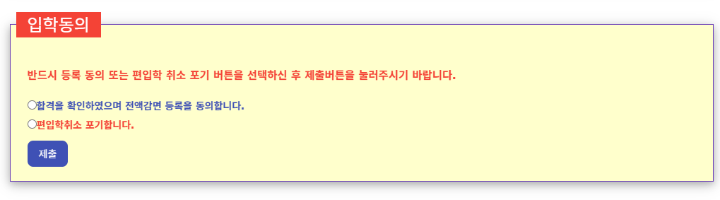 ※ 등록기간내에 입학동의를 하지 않을 경우 등록포기로 처리되며, 번복할 수 없음
